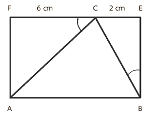 01 - La figura muestra un rectángulo ABEF y un triángulo ABC. Los ángulos ACF y CBE son iguales. Sabiendo que FC = 6 cm y CE = 2 cm, calcular el área del triángulo ABC.